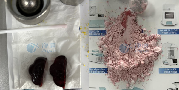 上圖為1分鐘的研磨效果,實驗結(jié)果顯示,軟糖樣品便已被研磨至細(xì)膩均勻的粉末狀,且一次可處理兩個樣品,極大地提高了工作效率。這一成果不僅證明了全自動樣品快速研磨儀在軟糖研磨中的卓越性能,也彰顯了其在復(fù)雜樣品處理方面的廣泛應(yīng)用潛力。相比傳統(tǒng)方法,JXFSTPRP-24L不僅顯著提升了研磨效率,還確保了研磨效果的均一性和穩(wěn)定性,為后續(xù)的成分分析提供了可靠保障。
