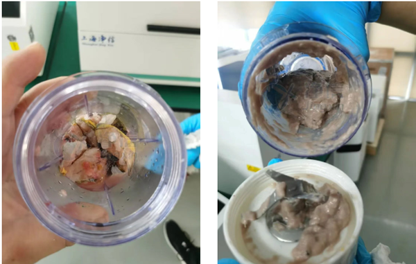 本次實(shí)驗(yàn)使用上海凈信的平行研磨儀對(duì)魚(yú)肉研磨后的肉泥非常均勻,無(wú)大塊顆粒,魚(yú)皮也被研磨充分,實(shí)驗(yàn)效果非常好,用戶很滿意。