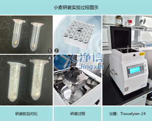 小麥樣品中提取DNA,之前采用研缽手工研磨的方法,在研缽內倒入液氮,在凍干狀態下快速研磨,研磨過程中葉脈不易研磨,整體研磨樣品不充分,影響實驗效果,因此選擇上海凈信多樣品組織研磨儀。