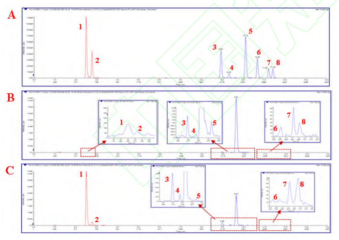 注:A.對照品;B.血清;C.肺組織;1.PGE2;2. PGD2;3. 15-HETE;4. 11(S)-HETE;5. 5-HETE;6. 14,15-EET;7. 11,12-EET;8. 8,9- EET