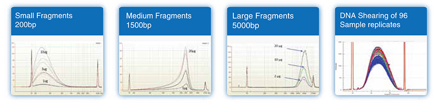 可對100bp-5kb范圍的DNA片段進(jìn)行高質(zhì)量的剪切,可得到高度重復(fù)的DNA剪切結(jié)果,并且DNA片段緊密分布在指定的大小范圍內(nèi),不同初始樣本量均能得到一致性的片段。